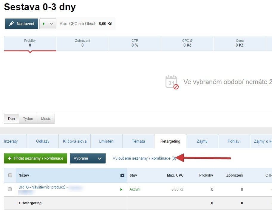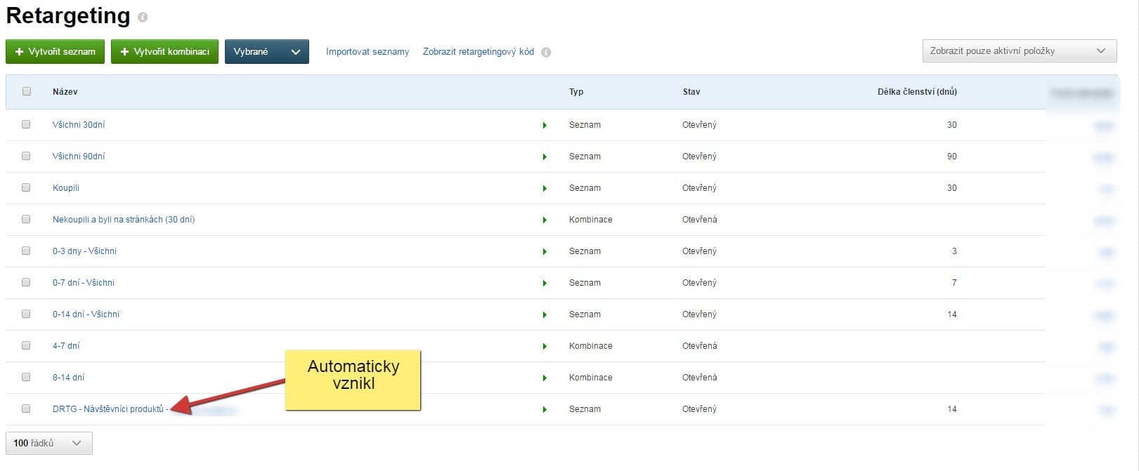 Pouze v záložce „Retargeting“, přidáte seznam „DRTG“: