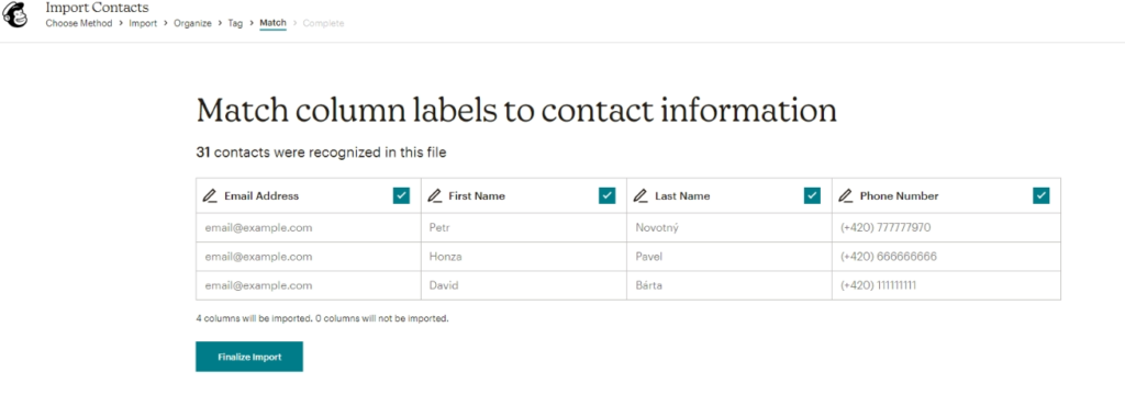 Následně se vám zobrazí tabulka vašich kontaktů a jejich označení (jméno, adresa, telefonní číslo,…) a dá vám možnost zkontrolovat správnost tohoto označení, případně opravit chyby.