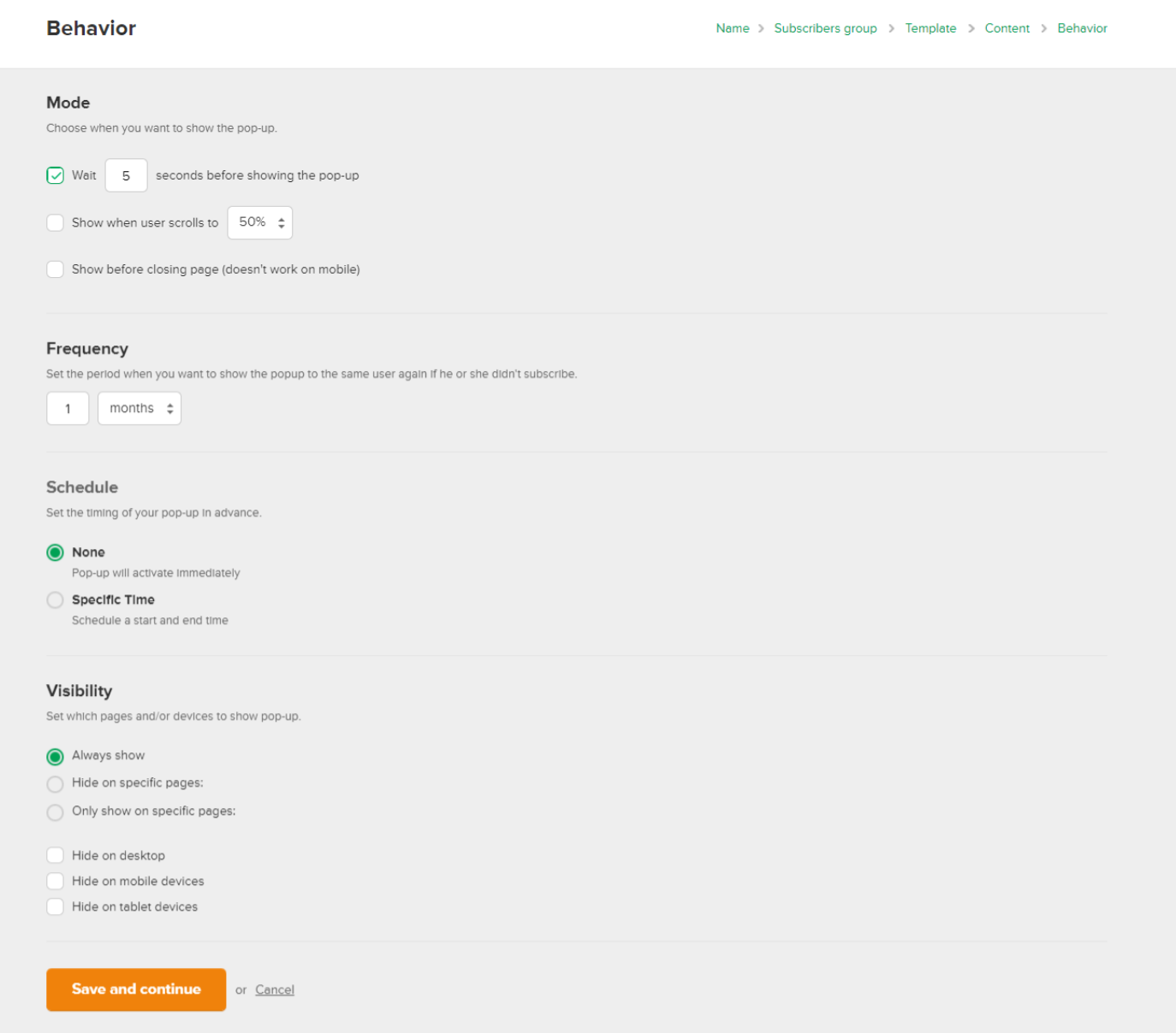 Po vytvoření pop-up okna v editoru se dostanete do nastavování jeho chování. Zde si můžete nastavit, po jaké době se zobrazí nebo, kam se musí uživatel na stránce dostat, aby se okno zobrazilo. Také lze nastavit, aby se zobrazilo před zavřením stránky, ale to samozřejmě nefunguje na mobilech. Dále si tu můžete nastavit frekvenci zobrazení pro jednoho uživatele, nastavit si, zda se začne zobrazovat ihned nebo například za týden. To se může hodit, když plánujete nějaký webinář a chcete mít přednastavené pop-up okno.